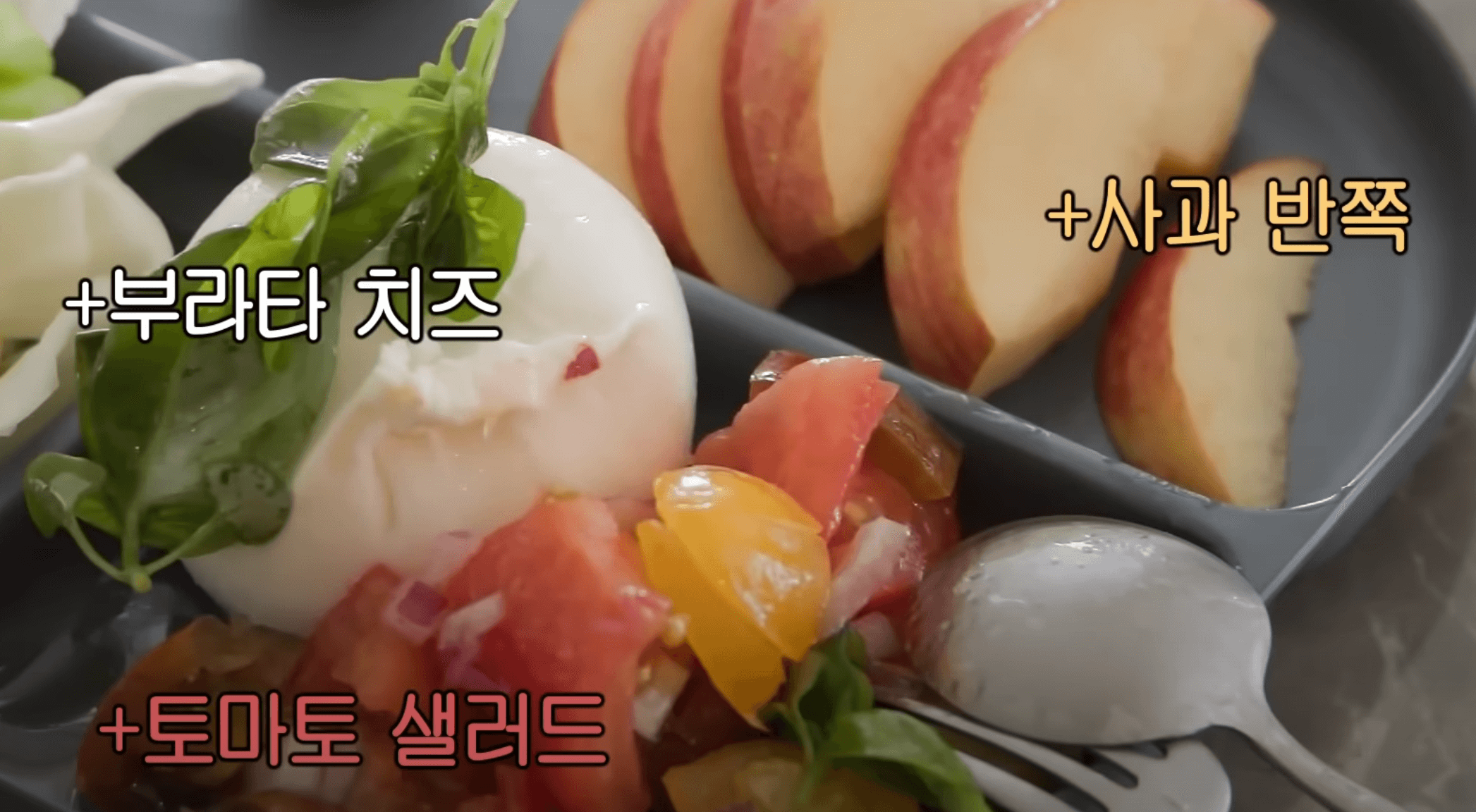 건강생식 재료 : 양배추 셀러리 계란 부라타 치즈 토마토 샐러드 사과 반쪽