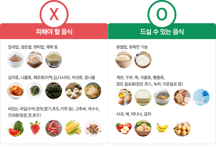 → 검사 3일 전 : 섬유질이나 해조류, 나물류, 버섯류 등은 피해 주시고 흰쌀밥, 흰 죽, 두부, 달걀 등 건더기가 없고 부드러운 음식을 섭취하시면 좋습니다.