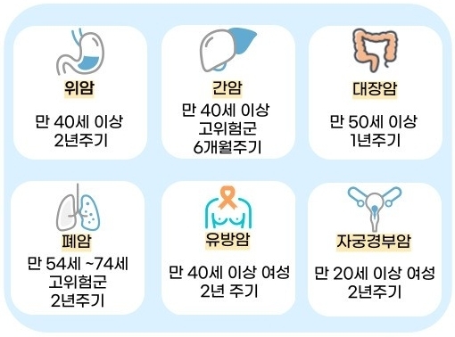 2년을 주기로 자궁암 검진 (만 20세 이상 여성), 위암 검진 (만 40세 이상), 유방암 검진( 만 40세 이상 여성) 이 가능하고 6개월 단위로 간암 검진 (만 40세 이상 고위험 군), 매년 대장암 검진 ( 만 50세 이상)을 받을 수 있습니다.