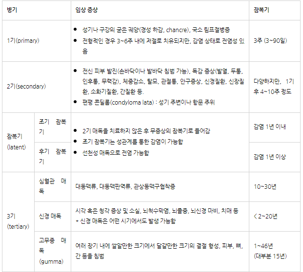잠복매독은 조기와 후기로 나누는데, 이는 전염성이 있는 2기 매독으로 거꾸로 진행할 가능성이 있는지 여부에 따른 분류입니다. 조기 잠복매독은 성행위를 통한 전염이 가능하나 후기 잠복매독은 전염되지 않습니다.